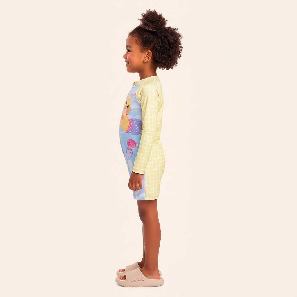 A parte superior do macacão apresenta um charmoso padrão quadriculado amarelo, enquanto o corpo é adornado com uma estampa sublimada de alta qualidade de dois adoráveis gatos sereia, acompanhados de uma medusa simpática e corais. A frase "Amigos do Mar" reforça o espírito de aventura. Para um toque de fofura extra, o gato sereia da esquerda possui um aplique de pompom nas bochechas, que adiciona uma dimensão sensorial e divertida. O zíper funcional na parte frontal facilita muito na hora de colocar a fralda para piscina e tirar.